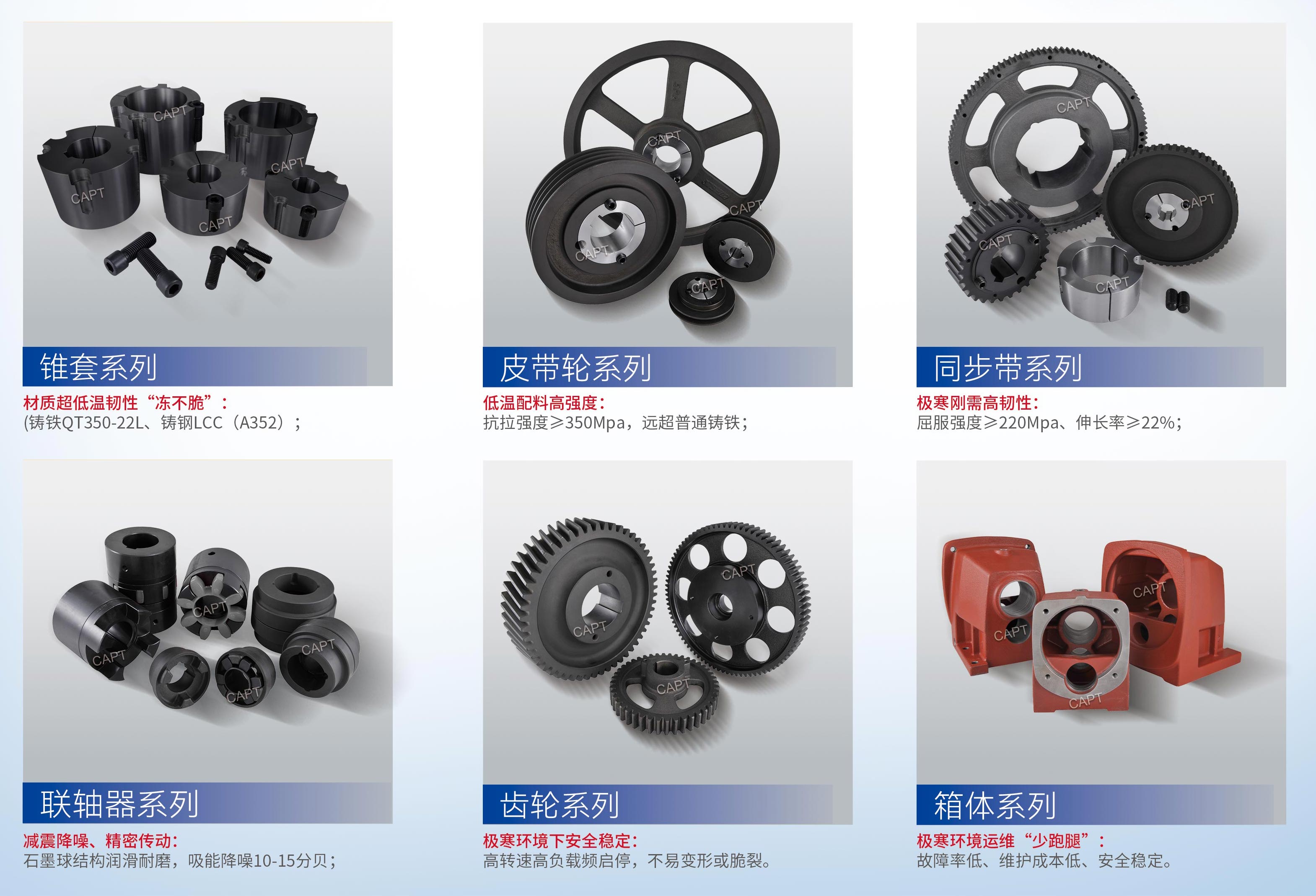 在高緯度冰封荒原、高海拔雪域等極端環境中,-30℃甚至 - 40℃的低溫如同 “隱形殺手”—— 普通機械傳動零件易因低溫脆性斷裂、尺寸變形、頻繁故障陷入癱瘓,不僅影響設備運行,更推高運維成本。而超低溫球墨鑄鐵或者鑄鋼傳動件(涵蓋皮帶輪、同步帶輪、鏈輪、齒輪、聯軸器、聯接錐套、箱體等全品類),正是為破解極寒挑戰而生的可靠之選。